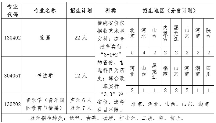 2.考生报考省级统考已涵盖的专业,须参加省级统考且成绩合格。学校各专业与省级统考科类对应关系如下:绘画为美术学和设计学类、书法学为书法学专业、音乐学(音乐国际教育与传播)为音乐学类。