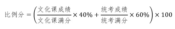 在实行平行志愿的省份,按照投档成绩从高到低的顺序择优录取。在实行顺序志愿的省份,按照比例分(四舍五入、保留小数点后两位)从高到低的顺序择优录取。比例分满分为100分,计算公式为: