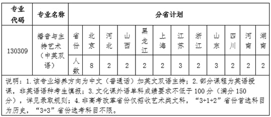 4.播音与主持艺术(中英双语)专业考生外语单科成绩不得低于100分。文化课外语单科成绩按照满分150分计算,根据生源地高考实际外语单科总分等比例换算(四舍五入、保留小数点后两位)。